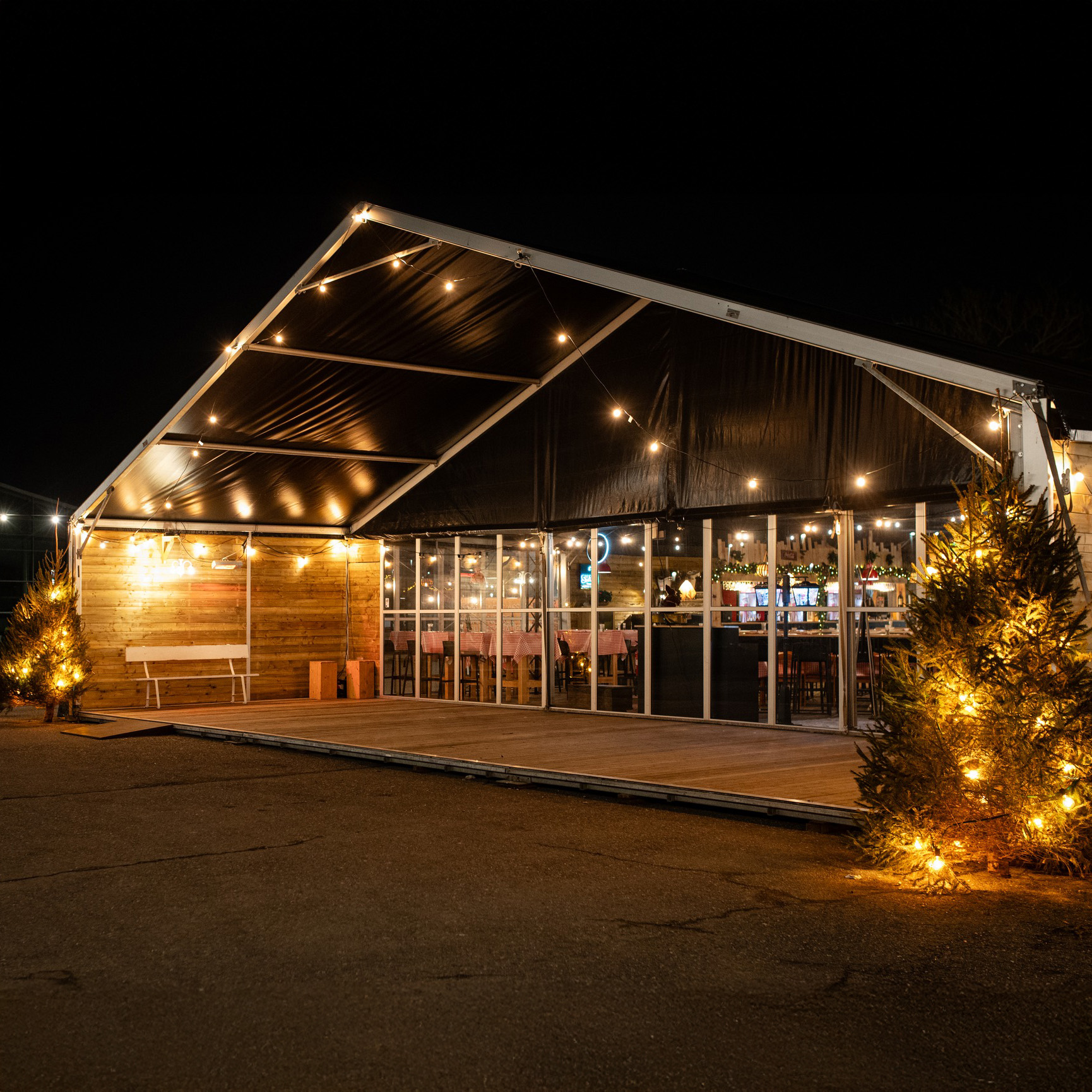 Pour ce restaurant éphémère, nous avons conçu un espace chaleureux et traditionnel avec un chapiteau au toit noir, des panneaux vitrés et des panneaux en bois pour une ambiance chalet authentique, un cadre idéal pour des moments conviviaux et gourmands réalisé avec soin pour recréer l’esprit cocooning de la montagne.